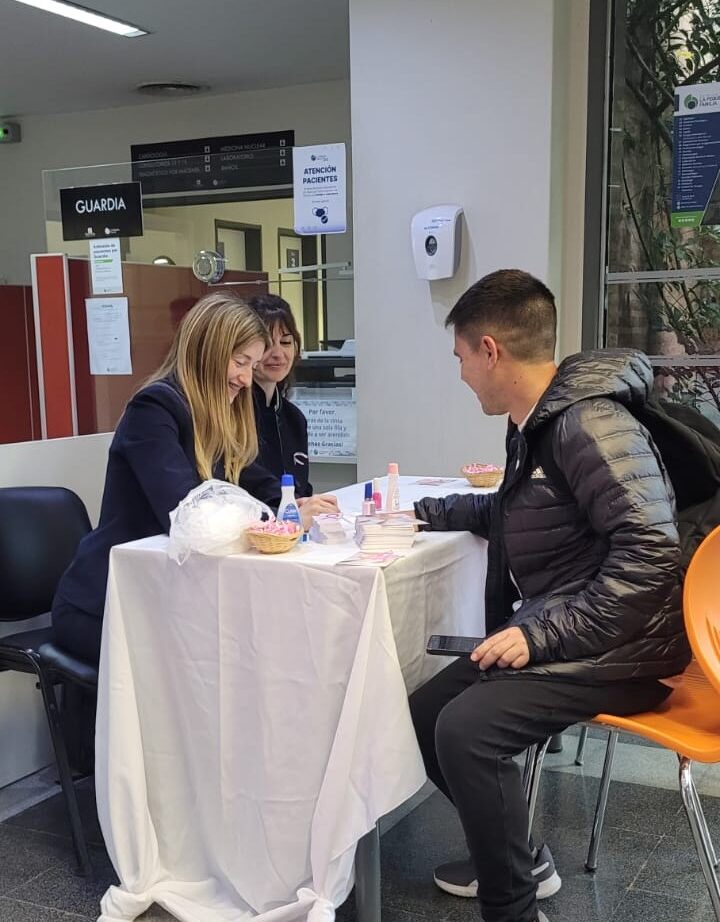 Simultáneamente, la acción «Conversar en Rosa» se replicó dentro de las instalaciones de nuestra institución. En este caso, el esfuerzo de concientización fue impulsado por el personal administrativo, quienes se encargaron de distribuir el lazo rosa, el sticker y el folleto entre los pacientes, familiares y visitantes.